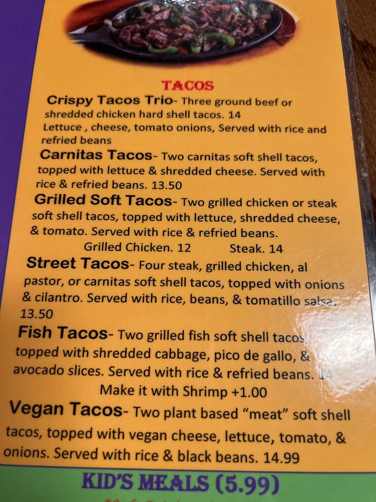 3 grilled chicken or steak soft shell tacos, topped with lettuce, shredded cheese, and tomato. Served with rice & refried beans.