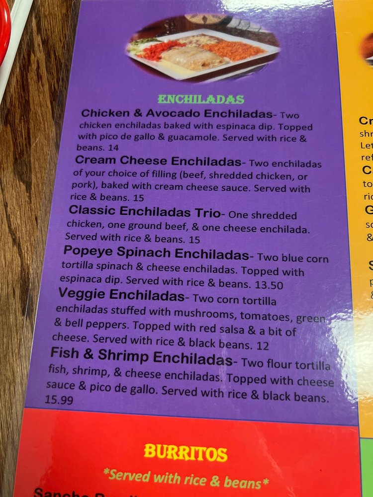 3 blue corn tortilla spinach & cheese enchiladas. Topped with espinaca dip. Served with rice & beans.